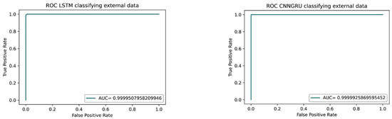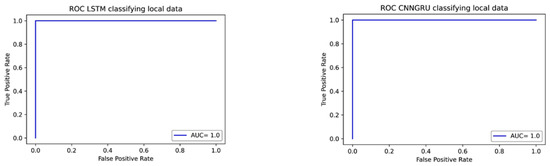Once the trained models were kept fixed, the experimental files were preprocessed following the selected processing context analyzed through previous steps and fed to the classifier in order to detect the goodness of the obtained success. Figure 8 (left) shows the receiver operating curve (ROC) of the LSTM model after applying the validation test and (right) the ROC curve of the CNNGRU model with the same data; in both cases, the local classification gave 100% accuracy with an area under the curve (AUC) of 1.