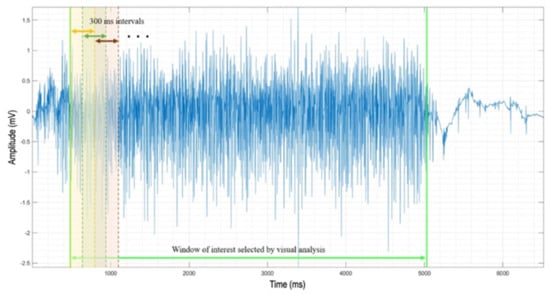 A custom-made Matlab software for the automatic analysis of the interference pattern has been developed. IP recordings exported to a text file (.txt) from the synergy electromyography machine are automatically imported in a Matlab environment by the software. IP signals are plotted and shown to allow an expert technician to interactively choose the time window of interest. The visual analysis ensures the selection of the IP window in which there is the maximum muscle contraction, characterized by both the highest amplitude and firing rate. Moreover, this method avoids signal artifacts that may not be automatically recognized by the software [27]. The selected window is divided into consecutive 300 ms intervals, with an overlap of 150 ms (Figure 1).