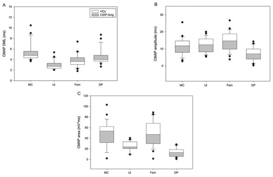 Analysis of the nerve conduction parameters, including area and amplitude of CMAP and DML, in HCs and CIDP patients is shown in Table 3 and Figure 2.