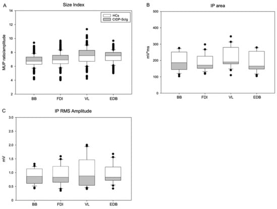 (A) Size index and (B,C) interference pattern analysis (IPA) in CIDP patients after ScIg treatment and HCs. Figure legend: HCs: healthy controls; CIDP: chronic inflammatory demyelinating poly-neuropathy; ScIg: subcutaneous immunoglobulin; BB: brachial biceps; FDI: first dorsal interosseous; VL: vastus lateralis; EDB: extensor digitorum brevis; MUP: motor unit potential; IP: interference pattern; RMS: root mean square.