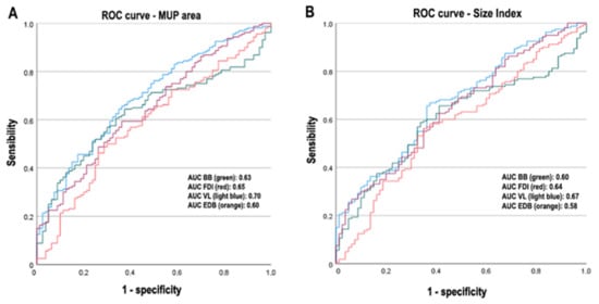 ROC curves for MUP area and size index (CIDP patients vs. HCs). Figure legend: BB: brachial biceps; FDI: first dorsal interosseous; VL: vastus lateralis; EDB: extensor digitorum brevis; MUP: motor unit potential; AUC: area under the curve.