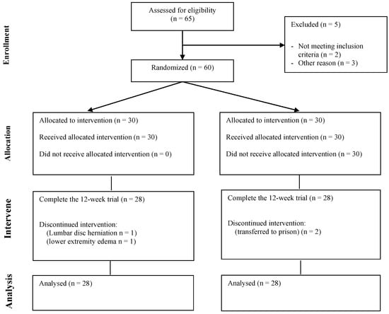 This study is a randomized, investigator- and outcome-indicator-blinded trial with subjects recruited from April 2021 to June 2021, who signed an informed consent form (see https://www.chictr.org.cn/ for details, accessed on 6 March 2021) prior to the start of the study. The study strictly adhered to the Helgiacin Declaration, and the experimental protocol was approved by the Ethics Committee of the Chengdu Sports Institute and registered with the China Clinical Trials Center (ChiCTR: 2200055348). MA-dependent individuals were screened strictly on the basis of meeting the inclusion and exclusion criteria. They were randomly divided into MA exercise group (MAE) and MA control group (MAC) in a 1:1 ratio by using random number table method. The MAC group underwent conventional educational detoxification, including educational correction and group psychological counseling, while the MAE group received 12 weeks of moderate-intensity aerobic exercise on the basis of conventional education. Due to the specificity of the intervention, the grouping results were not blinded to MA dependence but hidden from the raters of outcome indicators and the investigator. This study was reported in strict compliance with the CONSORT statement [23].
