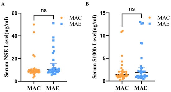 Serum NSE and S100b levels in MAE and MAC groups. (A): Serum NSE levels in the MAC and MAE groups; (B): Serum S100b levels in the MAC and MAE groups. ns: There was no significant difference in Serum NSE and S100b in the MAE group compared with the MAC group.