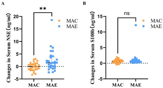 Amount of change in serum NSE and S100b in MAC and MAE groups before and after exercise intervention. (A): Amount of change in Serum NSE in MAC and MAE groups before and after exercise intervention.; (B): Amount of change in Serum S100b in MAC and MAE groups before and after exercise intervention. **: There was a significant difference in the amount of change in serum S100b before and after the exercise intervention in the MAE group compared to the MAC group; ns: Compared with the MAC group, there was no significant difference in the amount of change in serum NSE in the MAE group before and after the exercise intervention.