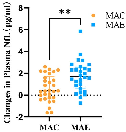 Amount of change in plasma NfL in the MAC and MAE groups after exercise intervention. **: There was a significant difference in the amount of change in Plasma NfL before and after the exercise intervention in the MAE group compared to the MAC group.