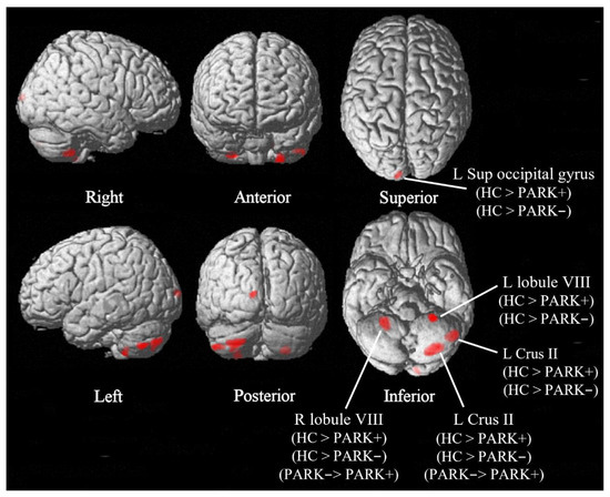 | 172 | 32.83 | <0.001 | −24 | −42 | −58 | L Cerebellum, lobule VIII | HCs > Park+ HCs > Park− |