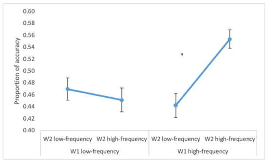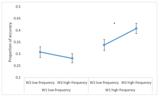 Figure 5. Experiment 3. Accuracy on W2 is reported in terms of the statistically significant interaction W1 frequency × W2 frequency. Bars represent standard errors. The asterisk (*) indicates statistically significant differences.
