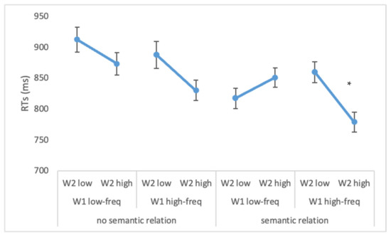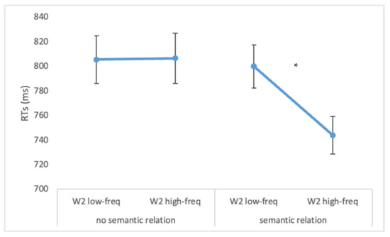 Figure 4. Reaction times for Experiment 2. The statistically significant interaction of semantic relation condition × W2 frequency is reported. Bars represent standard errors. The asterisk (*) indicates statistically significant differences.