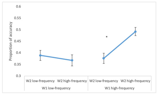 Figure 1. Experiment 1. W2 accuracy in the conditions of W1 and W2 low- and high-frequency. The figure represents the statistically significant interaction W1 frequency × W2 frequency. Bars represent standard errors. The asterisk (*) indicates statistically significant differences.