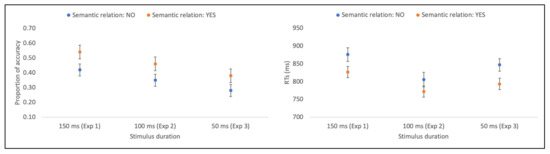 A summary of the results from the three experiments is reported in Figure 6, for both accuracy and response times, showing a more efficient processing of the parafoveal word when it is semantically related to the foveal word. This is the case for all the three tested experimental conditions and thus when the stimulus duration is 150, 100 and 50 ms.