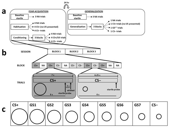 The top part of the figure depicts a summary of the 2-day fear-potentiated startle paradigm (a). The acquisition and generalization phases were separated by 24 h, and each phase began with 3 noise alone (NA) trials. Acquisition proceeded with a habituation phase, during which there were 4 NA, CS+, and CS− trials without any presentation of the US. Following habituation, participants underwent the conditioning phase, which consisted of 3 blocks of NA, CS+, and CS− trials, during which the CS+ was always paired with the US. The next day, generalization consisted of 3 blocks of NA, CS+, GS, and CS− trials; the US was not presented during any of these trials. The middle part of the figure depicts a diagram of the CS+ and CS− trials that occurred during the conditioning phase of acquisition (b). Participants were exposed to a total of 12 trials of 3 different trial types (NA, CS+, CS−) during each block. The timelines for stimulus exposure during the CS+ and CS− trials are depicted under these trial types. The lower part of the figure displays all 9 stimuli used during the generalization phase (c).