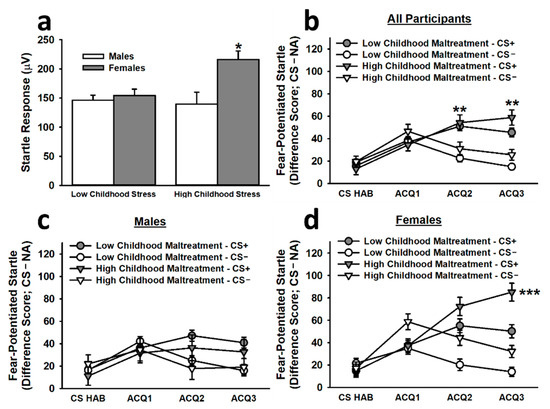 The analysis of baseline startle responses to the first three NA trials during acquisition revealed that females reporting high childhood maltreatment exhibited significantly greater startle responses than all other groups (main effect of childhood maltreatment: F(1,261) = 3.76, p = 0.054; main effect of sex: F(1,261) = 8.86, p = 0.003; Childhood Maltreatment × Sex interaction: F(1,261) = 5.78, p = 0.017; see Figure 2). To control for the impact of this difference on fear-potentiated startle responses, we included baseline startle responses as a covariate in the analysis of fear acquisition. This analysis revealed that, during the non-reinforced habituation segment (CS HAB) and the first block of reinforced acquisition trials (ACQ1), participants exhibited significantly greater fear-potentiated startle responses to the CS− than to the CS+. In the final two blocks of reinforced acquisition trials (ACQ2 and ACQ3), participants exhibited significantly greater fear-potentiated startle responses to the CS+ than to the CS−, demonstrating successful differential fear conditioning (main effect of trial block: F(3,777) = 2.63, p = 0.049; Stimulus × Trial Block interaction: F(2.90,751.91) = 8.11, p < 0.001). By late acquisition, females reporting high childhood maltreatment displayed significantly greater fear-potentiated startle responses to the CS+ than did females reporting low childhood maltreatment and males reporting high or low childhood maltreatment (Sex × Stimulus × Trial Block interaction: F(2.90,751.91) = 3.51, p = 0.016; Childhood Maltreatment × Sex × Stimulus × Trial Block interaction: F(2.90,751.91) = 2.95, p = 0.034).