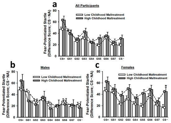 Fear-potentiated startle responses to the CS+, seven different GSs, and the CS− during the generalization phase on Day 2. The top figure inset (a) depicts fear-potentiated startle responses for all participants. Overall, participants exhibited a relatively smooth generalization gradient, with fear-potentiated startle responses being greatest to the CS+ and decreasing steadily as stimuli approached the CS−. No significant effect of childhood maltreatment on fear-potentiated startle responses was observed for males (b). Females reporting high childhood maltreatment demonstrated significantly greater fear-potentiated startle responses to the CS− than females reporting low childhood maltreatment (c). Moreover, females reporting high childhood maltreatment appeared to exhibit greater fear generalization, as, in contrast to all other groups, these participants displayed statistically equivalent fear-potentiated startle responses to the CS+, GS1, GS2, GS3, GS5, GS6, and CS−. Data are means ± SEM. * p < 0.001 relative to low childhood maltreatment.