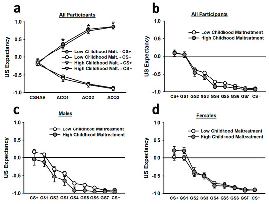 The present findings suggest that childhood maltreatment is associated with sex-dependent effects on the acquisition and expression of conditioned fear. Specifically, females reporting high childhood maltreatment exhibited stronger fear learning and greater fear generalization than females or males reporting low childhood maltreatment. The sex-dependent nature of these findings is consistent with some existing research and should be examined more thoroughly in future studies. The neurobiological processes that underlie the observed alterations in females reporting high childhood maltreatment are not necessarily maladaptive. Indeed, in a child who endures chronic stress, it is adaptive for the brain to anticipate a high amount of stress throughout one’s lifespan and adjust its processing to enable rapid and efficient learning regarding new threats. Nevertheless, these seemingly adaptive processes can have maladaptive consequences and result in the expression of fear when no threat is present (see [82] for a related argument). Collectively, the findings presented here may prompt additional research that can inform clinicians about the mechanisms underlying female susceptibility to psychopathology.