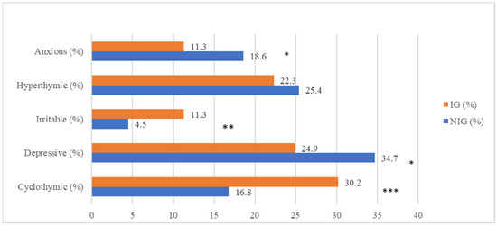 Distribution of trait-related impulsivity among affective temperaments. * p < 0.01; ** p < 0.001; *** p < 0.000, NIG: non impulsivity group; IG = impulsivity group.