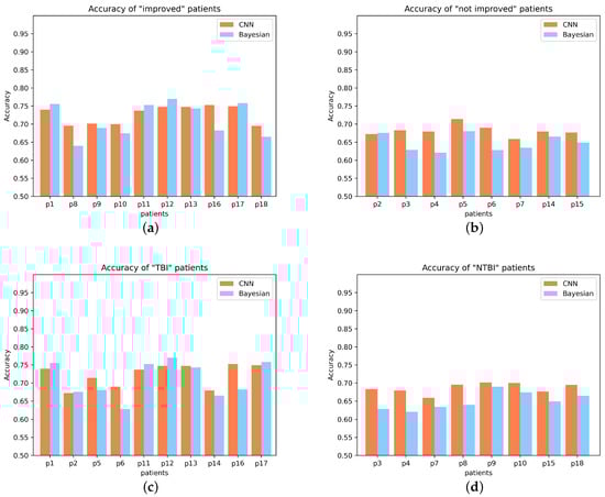 Upper panel: (a,b) represent the P300 detection accuracy of “improved” patients and “not improved” patients, respectively; (c,d) represent the P300 detection accuracy of TBI patients and NTBI patients, respectively.