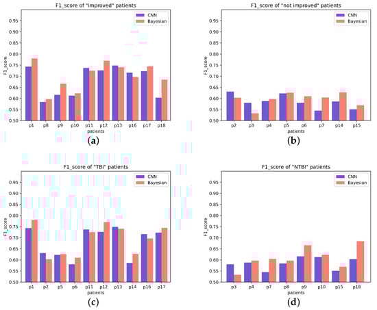 Upper panel: (a,b) represent the F1_score of “improved” patients and “not improved” patients, respectively; (c,d) represent the F1_score of TBI patients and NTBI patients, respectively.