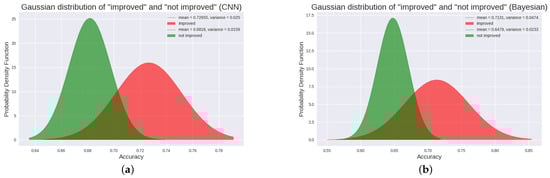 Panel (a) depicts the Gaussian distribution between “improved” patients and “not improved” patients using the CNN method. Panel (b) depicts the Gaussian distribution between “improved” patients and “not improved” patients using the Bayesian method. The probability distribution of “improved” patients and “not improved” patients. The red one is the Gaussian distribution fitted to the P300 detection accuracy of the “improved” patients, and the green one is the Gaussian distribution fitted to the P300 detection accuracy of the “not improved” patients. From the figure, we can see that there is a significant difference in the P300 detection accuracy of the two types of patients, and the P300 detection accuracy of the “improved” patients is significantly higher than that of the “not improved” patients.