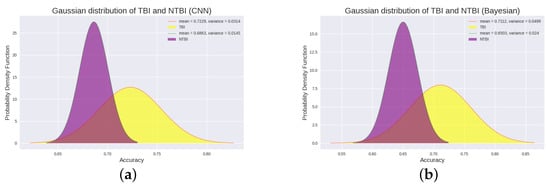Panel (a) describes the Gaussian distribution between TBI patients and NTBI patients using the CNN method. Panel (b) depicts the Gaussian distribution between TBI patients and NTBI patients using the Bayesian method. The probability distribution of “TBI” patients and “NTBI” patients. The yellow one is the Gaussian distribution fitted to the P300 detection accuracy of the “TBI” patients, and the purple one is the Gaussian distribution fitted to the P300 detection accuracy of the “NTBI” patients. From the probability distribution plot, we found that the P300 signal differed between TBI patients and NTBI patients. This is also an important manifestation of P300-based technology for classifying TBI patients and NTBI patients.