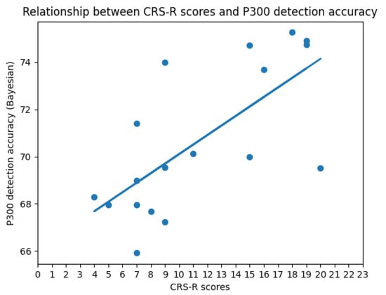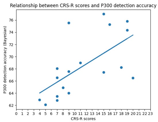 The positive linear relationship (the linear correlation coefficient is 0.63165) between the CRS-R scores and P300 detection accuracy (Bayesian) is shown in Figure 7. The same conclusion as above can be obtained here.