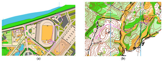 Specialized scene stimulation materials: 800 × 600 pixel orienteering standard competition maps were used, which were made by three nationally qualified orienteering mapmakers and rated for difficulty, to establish the two difficulty levels of simple maps and complex maps. Simple maps are mostly town scenes, and map information is mostly about buildings and other features of landforms (see Figure 1a). Complex maps are mostly mountain scenes, and map information is mostly about mountains and other geomorphic features (see Figure 1b). All stimulus materials were drawn using orienteering maps that had not been featured in orienteering events in the recent year, using the OCAD 11.0 version mapping software developed by the International Orienteering Federation (Karlstad, Sweden).