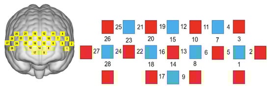 The experimental instrument was a portable near-infrared spectral brain function imaging system, Nirsport 2, to detect the hemodynamic signal of local brain regions during the subject’s task. Using the international 10–20 localization system as a reference, the lowest probe was placed along the Fp1–Fp2 line, and the system’s own PFC template was used, including 13 light source probes as well as 8 receiver probes, which together constituted 28 measurement channels, with the sampling frequency set to 7.8125 Hz (see Figure 2). An elastic head cap was used to fix the template and the head. When placing the detector probes and NIR light source probes in the template, the subject’s hair needed to be fully ruffled to ensure full contact between the probes and the scalp. The 3D digitizer (FASTRAK system) was used to locate the probe position, and the NIRS_SPM software determined the MNI spatial coordinates of the fNIRS channel position by the probabilistic alignment method to find the corresponding brain regions in the adult Brodmann area (Brodmann) atlas, and a total of four ROIs were delineated (see Table 2)—left brain regions: left ventral lateral prefrontal cortical region (L-VLPFC), left dorsolateral prefrontal cortical area (L-DLPFC); right brain area: right ventral lateral prefrontal cortical area (R-VLPFC), right dorsolateral prefrontal cortical area (R-DLPFC) (see Table 2).