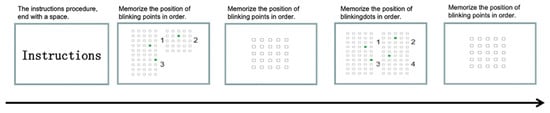 The experiment consisted of two spatial memory task scenarios: a non-specific task scenario and a specific task scenario. The Corsi block-tapping task paradigm, which is widely used in clinical and experimental studies to assess visuospatial attention, working memory processes, and spatial memory breadth in healthy participants and patients with known or suspected brain injury, was chosen. It requires participants to remember the sequential order of blocks in a sequence and to recreate a series of scenes by tapping on the blocks, allowing measurement of visuospatial short-term memory capacity [27]. Differences in the general spatial memory ability of orienteers at different levels were assessed by recording the subjects’ spatial memory breadth scores.