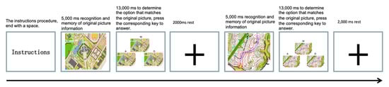 The subjects were first asked to familiarize themselves with the experimental instructions, then a 5000-ms original map stimulus memory phase appeared, in which the subjects were asked to memorize the information points and path information as quickly and accurately as possible, followed by a 13,000-ms option map phase on the screen (in which the option map consisted of three alternative items, located on the upper middle, lower left, and lower right sides of the screen, corresponding to the response keys “W”, “A”, and “D”), the subject selected the picture that corresponded to the memory stimulus as accurately and quickly as possible, and pressed the response key corresponding to it. The system automatically recorded the correctness rate and response time of the subject, and then let the subject stay relaxed for 2000 ms until the next trial.