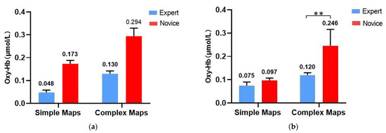 Results of fNIRS for the map-recognition spatial memory task; (a) L-VLPFC; (b) L-DLPFC; (c) R-VLPFC; (d) R-DLPFC. ** represents 0.001 < p < 0.01.