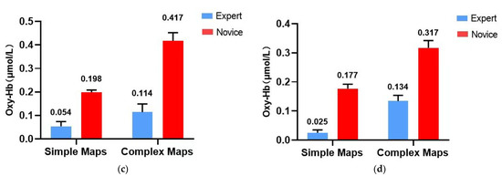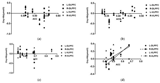 Correlation between Oxy-Hb concentration in the region of interest and the correctness rate (Note: * represents 0.01 < p < 0.05, ** represents p < 0.01). (a) Novice group simple map; (b) novice group complex map; (c) expert group simple map; (d) expert group complex map.