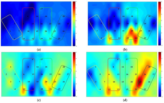 Results of fNIRS for the map-recognition spatial memory task. This figure depicts the activation level of brain regions at different maps (task difficulty) for the expert and novice groups. The more the colors are skewed toward warm colors (orange, red) the higher the activation level of the region, and the more the colors are skewed toward cool colors (blue, green) the lower the activation level of the region. Numbers represent different brain channels (a) Expert group simple map; (b) novice group simple map; (c) expert group complex map; (d) novice group complex map. The colored boxes from left to right in the picture represent different brain regions, yellow: L-VLPFC; red: L-DLPFC; grass green: R-DLPFC; olive green: R-VLPFC.