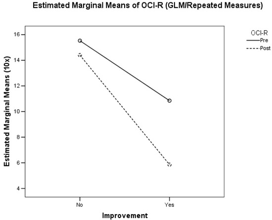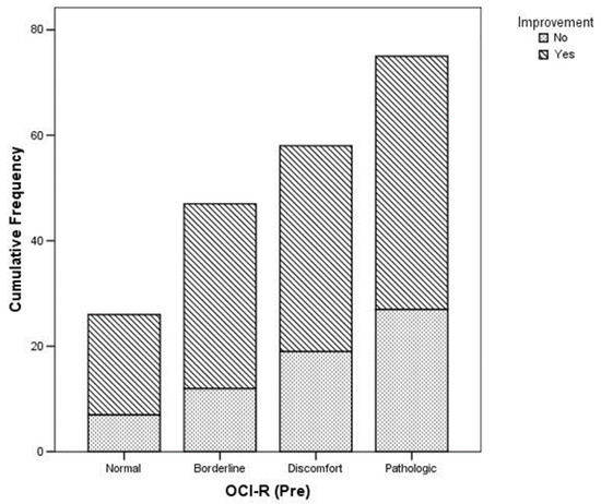 Relationship between OCI-R at T0 and clinical improvement (p = 0.002).