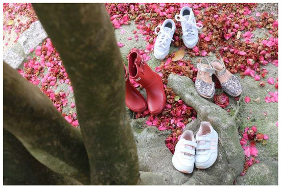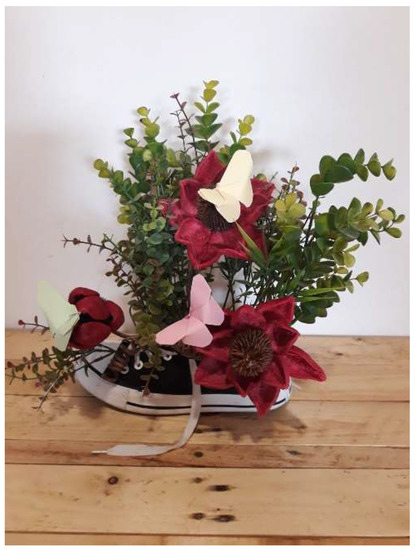 The last activity consisted of an artistic creation based on life stories. The work was about the person with whom they had exchanged shoes, discussed, and developed the life story. The productions were raised based on aesthetic and technical freedom, considering the diversity of a student’s life paths. The only requirement was to include some shoes or a related accessory. Each student initiated the creative process with sketches and writings about the relevant aspects and characteristics of their classmate’s biography. The production was supported with photographs, drawings, and artistic installations.