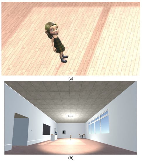 Snapshots of the VR session environment and avatar. (a,b) display a close-up and a broader view of the environment and avatar in the VR session, respectively.