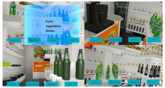 VRT was executed once a day, five times per week, and lasted for two weeks. A supermarket situation based on VR techniques was designed. The virtual supermarket simulated a supermarket with a variety of goods, such as drinks, tea sets, kitchenware, fruits and vegetables. There was also a shopping cart. Unity 5.3.5f1 (Available online: https://unity3d.com, accessed on June 2017) and Visual Studio 2015 (Microsoft) were used to design and create the VR program. The details of the VR program were described in our previous study [34]. The patients were asked to complete different shopping tasks with different lists. The shopping tasks included task A and task B, and each task consisted of four levels. At the beginning of each task, the participants became familiar with the procedures as follows: