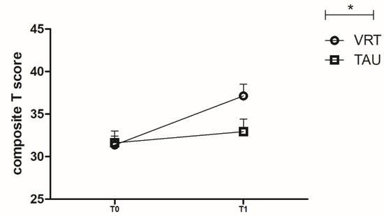 For the MCCB composite T score, two-way repeated measures ANOVA showed that there was a significant interaction between time and group (F = 19.119, p < 0.001). Pairwise comparisons showed that no difference was found in MCCB composite T scores between TAU and VRT group at T0 (F = 0.00, p = 0.985). However, the MCCB composite T score of VRT group was significantly higher than that of the TAU group at T1 ((37.15 ± 7.54 vs. 32.94 ± 8.28; F = 5.093, p = 0.032, η2 = 0.149). In VRT group MCCB composite T score at T1 was significantly higher than that at T0 (F = 68.630, p < 0.001, η2 = 0.703) while in TAU group no difference was found between T0 and T1(F = 2.694, p = 0.111) (Figure 2).