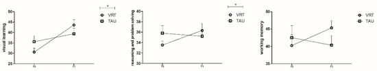 Legends: Figure 3 Line chart showing the changes of ViL, RPS and WM T scores between T0 (VRT: 30.57 ± 10.21, 30.57 ± 10.21 and 40.23 ± 17.08; TAU: 35.56 ± 15.19, 34 (30.25, 42)) and 42.50 ± 19.78 and T1 (VRT: 30.57 ± 10.21, 30.57 ± 10.21 and 45.33 ± 11.18; TAU: 35.56 ± 15.19, 34 (30.25, 42) and 40.34 ± 15.68), p = 0.002, 0.001, 0.086, respectively, * p ≤ 0.007).