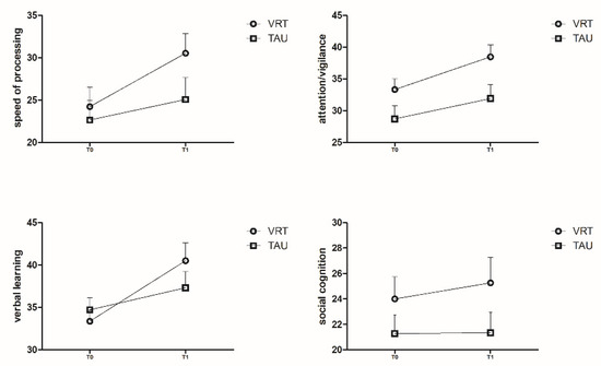 As shown in Figure 2, Figure 3 and Figure 4, many changes in MCCB T scores were observed from T0 to T1 in the VRT group.