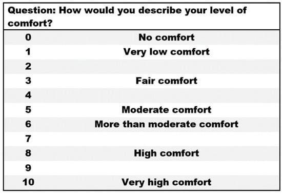 The experiment consisted of two tasks: (1) maximum voluntary contraction (MVC) and (2) isometric force exertion. In the MVC task, the participants were asked to apply the maximum force for 3 s for each of the three trials, with a 30 s rest period between each trial. Then, a 5 min rest was provided to avoid muscle fatigue. In the isometric arm flexion task, participants were asked to exert a force that matched one of five predefined exertion levels: (1) extremely light, (2) light, (3) somewhat hard, (4) hard, and (5) extremely hard. These predefined force levels were adapted from a 6–20 scale of the rate of perceived exertion (RPE) proposed by Borg [], a well-known and validated scale commonly used in ergonomics research [,]. The participants were asked to maintain steady-state exertion for 3 s for three trials, with a 120 s rest period between each trial. After each trial, the participants were asked to subjectively assess the level of physical comfort that corresponded to the exerted force (N) using an 11-point scale of perceived physical comfort proposed by Karwowski, W. [] (see Figure 3). The order of force exertion levels was randomly determined to prevent potential learning effects.