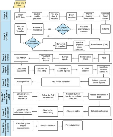 The data processing workflow consisted of ten stages (see Figure 5), including data curation, cleaning, artifact removal, dipole localization, feature extraction, source reconstruction, ROI definition, functional connectivity estimation, graph theory calculations, and statistical analyses.