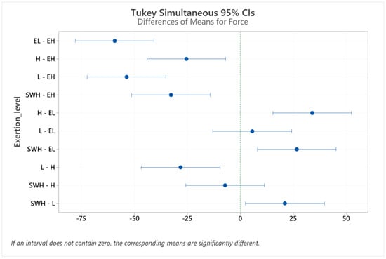 An analysis of variance (ANOVA) was used to assess the effect of predefined physical exertion levels on the generated arm forces. Tukey’s post hoc multiple-comparison test was also performed to identify significant differences in exerted forces.