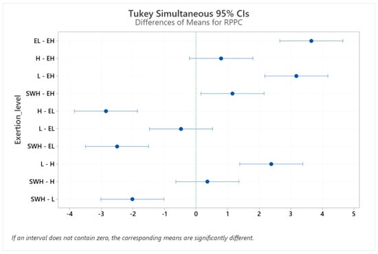 Pairwise comparisons among exertion levels (extremely hard, hard, somewhat hard, light, and extremely light) were performed using Tukey’s post hoc test, and adjusted p-values were computed (see Table 5). Results revealed no significant differences for hard vs. somewhat hard or light vs. extremely light exertion (Figure 6).