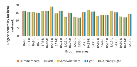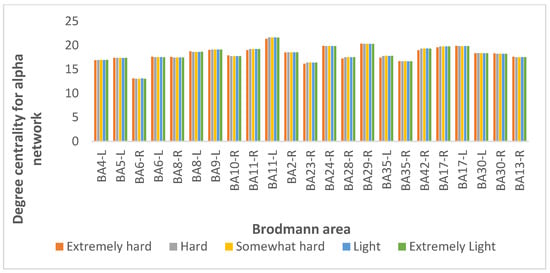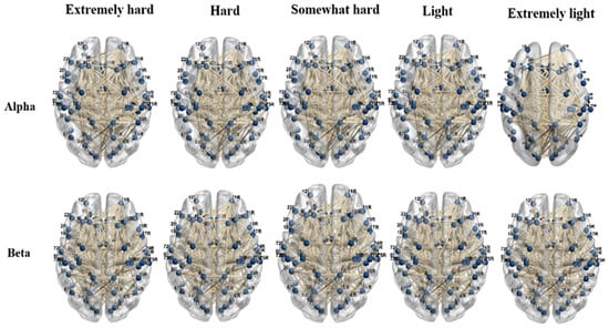 Evaluations of communication patterns can contribute to our understanding of information processing and brain functional organization during the execution of a motor task []. Predominant frontal-motor coupling in the alpha band and fronto-occipital coupling in the beta band have been found during a suboptimally controlled task []. Moderate changes in brain activity in the prefrontal cortex and greater changes in the parietal lobe have been observed with the elevation of exercise intensity []. Porter et al. [] reported an increase in the functional brain network of the frontal region associated with physical and cognitive exertion tasks. High-resistance pedal exertion strengthens intracerebral connections []. High coherence values have suggested an increase in functional connectivity during a muscle exertion task []. Previous evidence suggests that cortical brain function is influenced by various exercise modes, preferences, intensities, and workloads [,,,]. Recently, a graph theoretical approach has been applied to characterize changes in functional network efficiency during physical activities []. Graph theory is a powerful mathematical tool [] that provides a conceptual framework for studying neurophysiological data to characterize brain topological organization and explore brain connectivity patterns [,,].