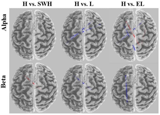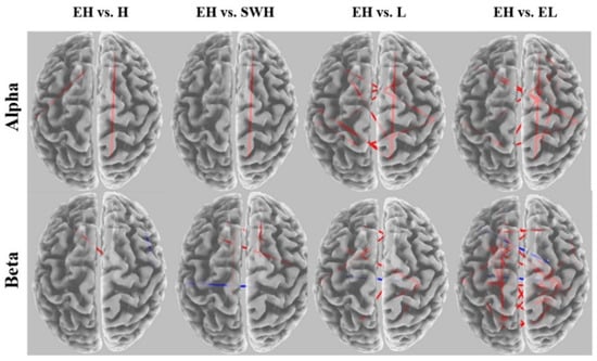 For functional connectivity analysis, we utilized a method that applies a single voxel at the centroid of each BA using eLORETA software [,,,]. A connectivity analysis between pairs of 84 ROIs in two EEG frequency bands was conducted for all physical exertion levels using independent sample t-tests that were corrected for multiple comparisons using a nonparametric randomization method based on the “maximal statistic.” The same permutation test was applied with 5,000 randomizations to identify the critical probability thresholds at significant levels and to correct type 1 errors.
