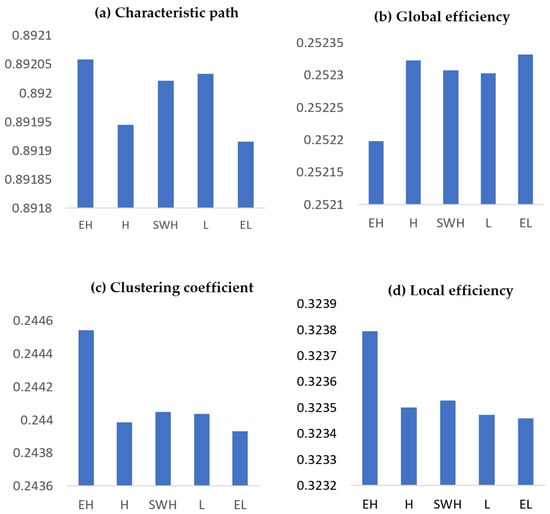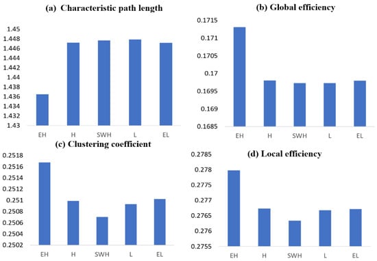 Local graph theory measures, such as betweenness, degree, eigenvector centrality, and nodal efficiency [,], are commonly used to evaluate nodal centrality and detect network hubs. Watts and Strogatz [] demonstrated that the nervous system has small-world properties characterized by strong local clustering among network nodes with short path lengths between neighboring nodes []. Small-world networks balance the segregation and integration of information [,,]. Studies of functional and effective brain analysis suggest that the brain has small-world properties that ensure high local and global information transfer efficiency with low wiring costs [,,].
