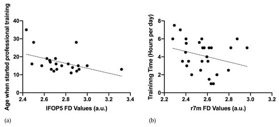 Increased FD in lFOP5 is inversely correlated with the starting age of professional chess training (ρ = −0.544, p = 0.007) (Figure 3a). Furthermore, reduced FD on the right 7 m of professional chess players shows a trend for negative correlation with the daily duration of chess training (ρ = −0.384, p = 0.040) (Figure 3b). No significant correlation is found between the FD and Elo scores.