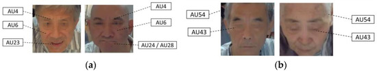 FACS features of strained and tired expressions: (a) the strained expressions spontaneously appeared by patients when their limb muscles were tense during training; (b) the tired expressions occurred when the patients were resting or undergoing prolonged passive training.