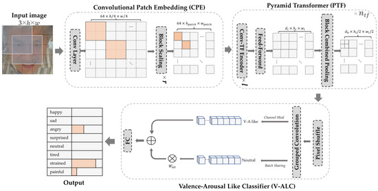 In order to occupy fewer computing resources to identify eight facial expressions of stroke patients accurately, we propose a lightweight FER model shown in Figure 3, named the Facial Expression Recognition with Patch-Convolutional Vision Transformer (FER-PCVT). The FER-PCVT designed with ViT as the baseline mainly consists of three modules: the Convolutional Patch Embedding (CPE), the Pyramid Transformer (PTF), and the Valence-Arousal-Like Classifier (V-ALC). The first two modules combine to form the backbone network, Patch-Convolutional Vision Transformer (PCVT). The V-ALC is an expression classifier designed based on the Valence-Arousal (V-A) emotion theory [40].