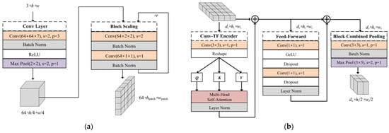 Compared with the direct processing of pixel information of images using the transformer encoder of ViT, the accuracy will be further improved by using CNNs to extract the feature information from images and then processing them with the transformer encoder [35,41]. Based on this, the convolutional patch embedding module is implemented as a pixel-to-sequence mapping module to extract the feature sequences as the input of the Conv-TF Encoder of the pyramid transformer module. Specifically, the feature information extracted from the image by the convolutional layer and pooling layer is reduced to the patch size by the Block Scaling module. The Block Scaling module, consisting of two convolutional layers (size 2 × 2, stride 2, and size 1 × 1, stride 1), is applied to adjust the dimensions of feature maps entered into the Conv-TF Encoder by varying the number of repetitions. That is, the length and width of the sequence will be shortened to of the original size after repeating r times. This method of introducing convolutions into ViT achieves feature mapping from pixel to sequence while preserving the position information between patches. The detailed structure is shown in Figure 4a.