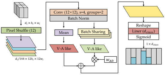 We adopt the pixel shuffle method to reshape low-resolution feature maps into high-resolution ones. That is, the length and width of the input feature map are up-sampled by 12 times, and the result is condensed using a convolution kernel of size 12 × 12. These compressed sequences are grouped into the Channel Mean and the Batch Sharing to obtain the V-A-like and neutral features with one dimension, respectively. The result of multiplying the neutral feature with the adaptive weight is added to the V-A-like feature to output a complete feature map of emotion. Among them, is a parameter learned by the model from many training samples. The Channel Mean means averaging the values of different channels in the same batch, thereby reducing the channel dimension. The Batch Sharing refers to averaging the values in different batches on the basis of the Channel Mean, which aims to extract the most appropriate characteristics of neutral emotions from batches. Their expressions are Equations (5) and (6).
